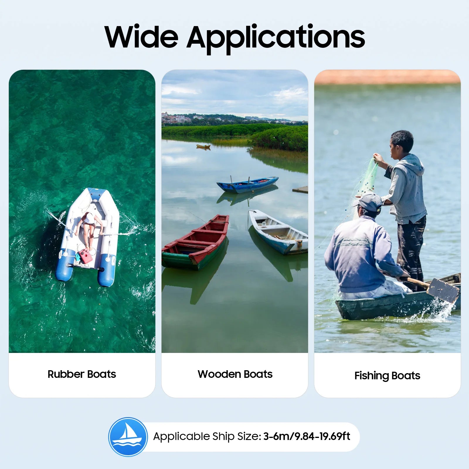 The product is suitable for small boats of 9.84-19.69ft such as rubber boats, wooden boats, fishing boats, etc. It can be widely used in water sports, water tourism, fishery production, and other fields.