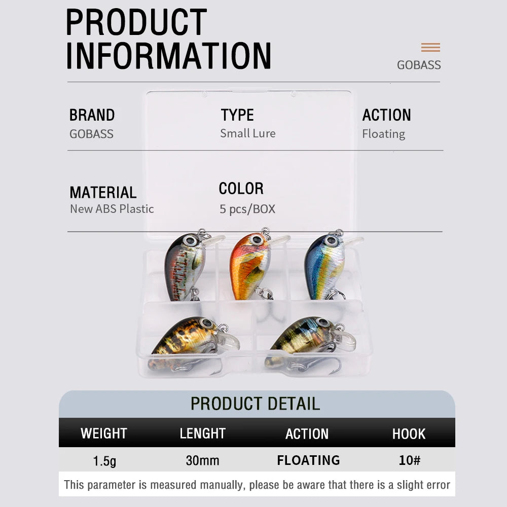 GOBASS 5pcs Mini Fish Bass Fishing Lure Set 3cm 1.5g Mini Artificial Baits